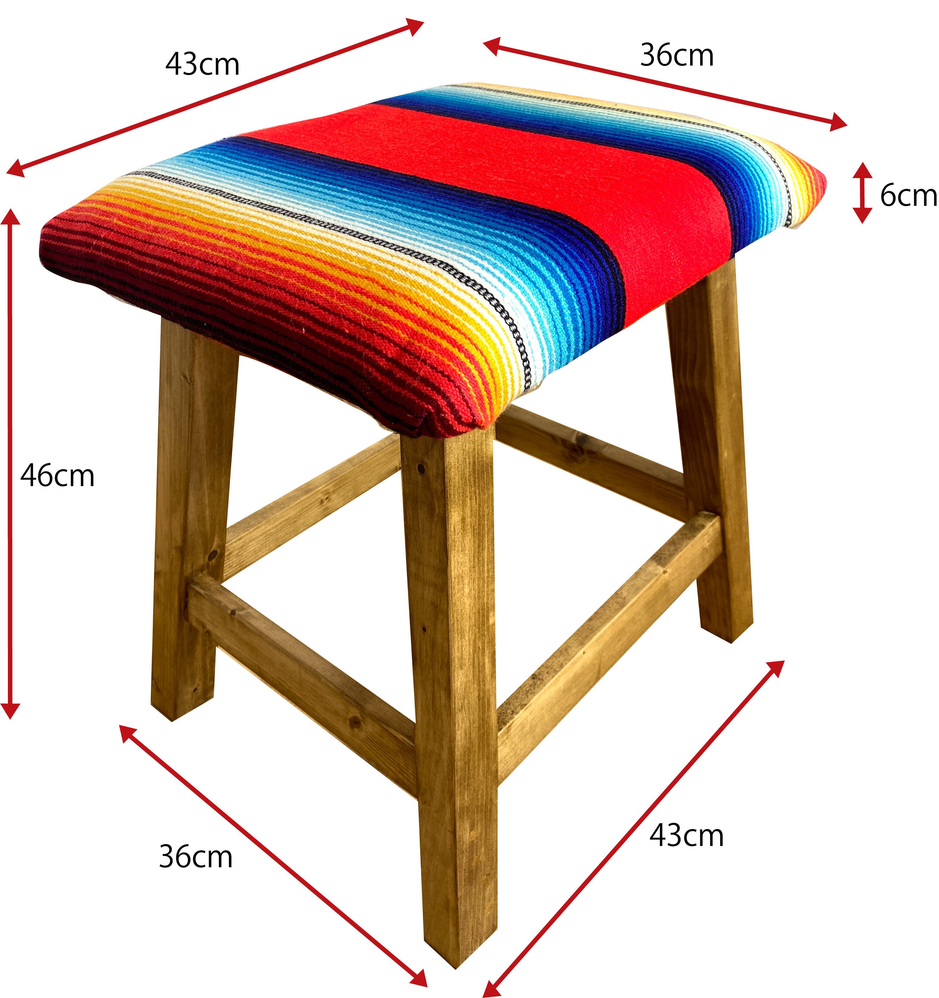 サラぺ(メキシコの伝統的な織物)を使用した座面が特徴のスツールです。カラフルなボーダー柄が目を引き、リビングやダイニングルームに彩りを加えてくれます。ご家族とのくつろぎタイム、ご友人とのティータイムなど幅広いシーンでご活用いただけるアイテムです。