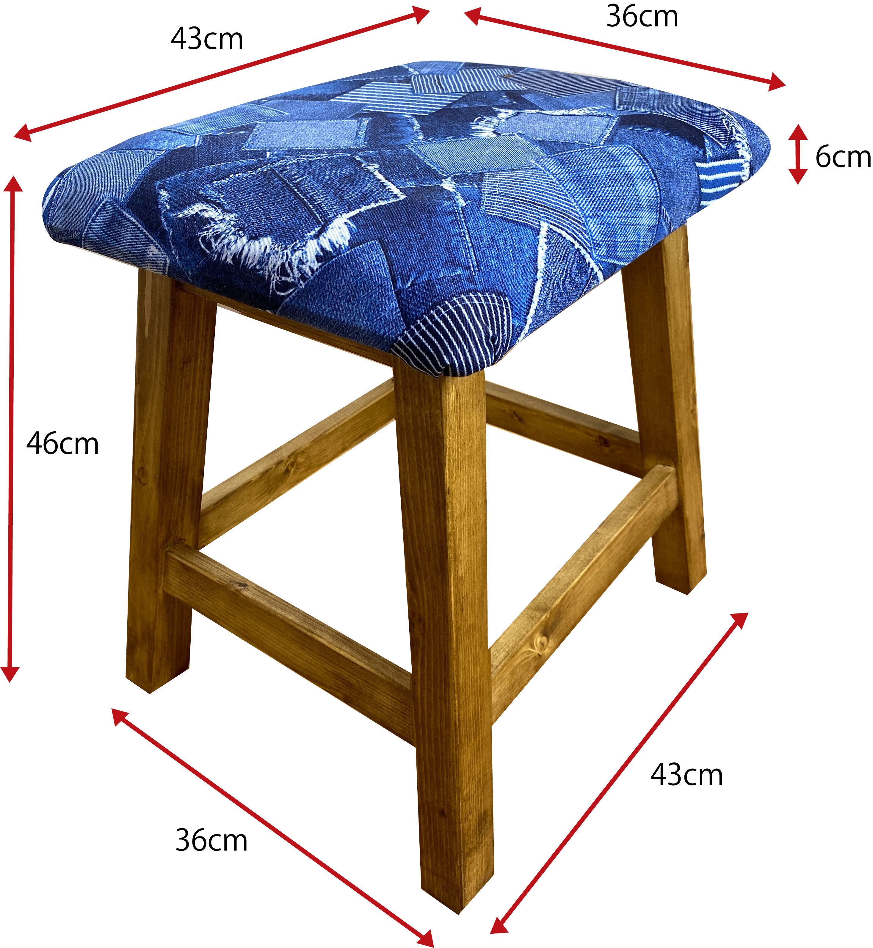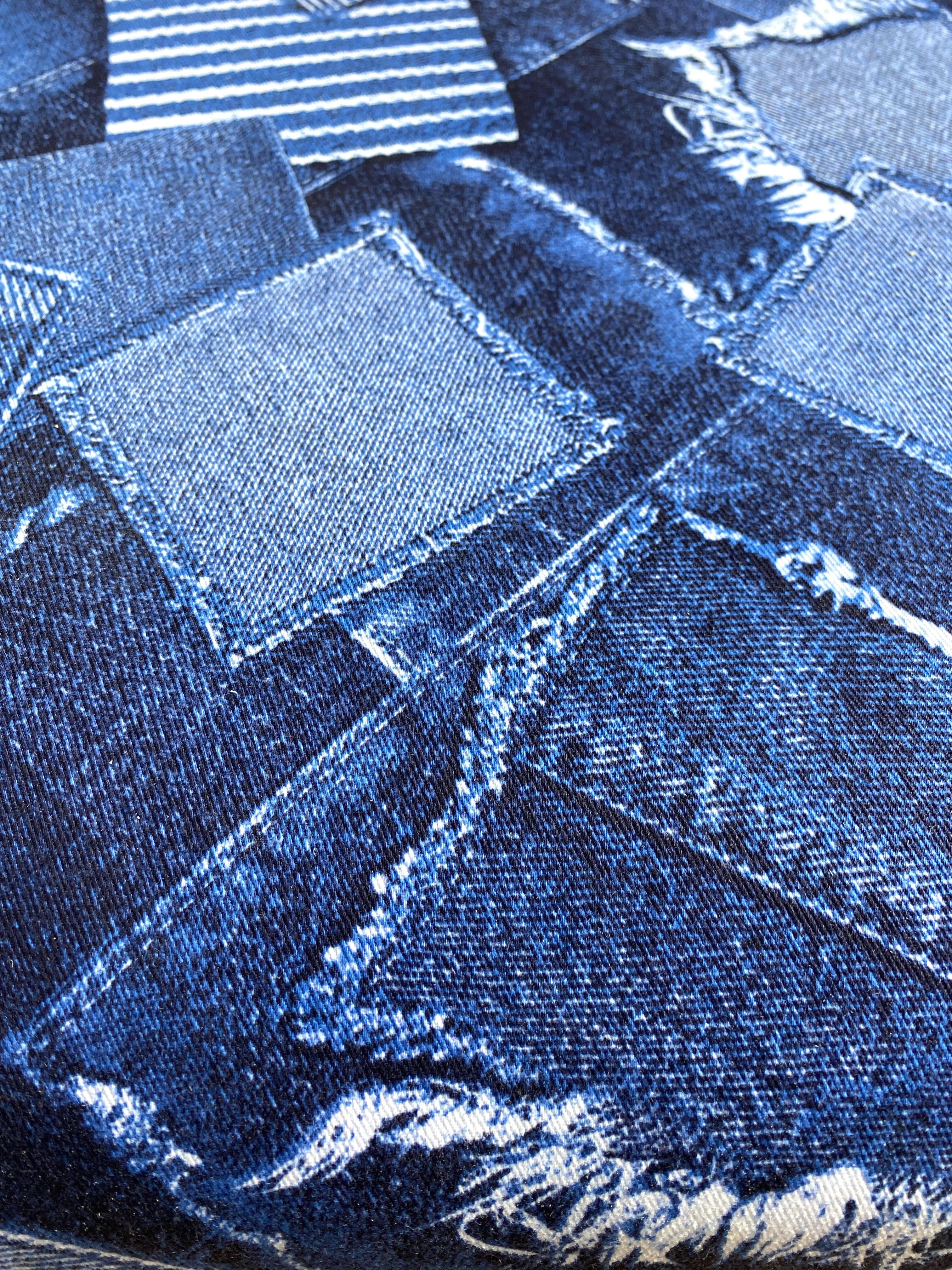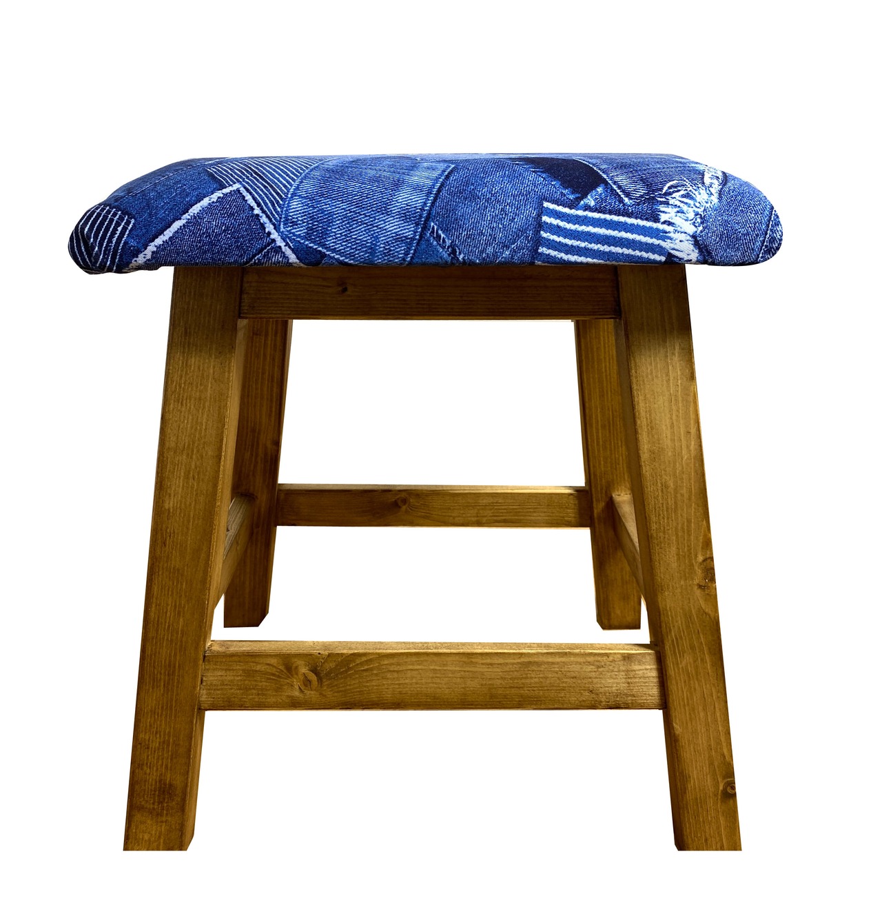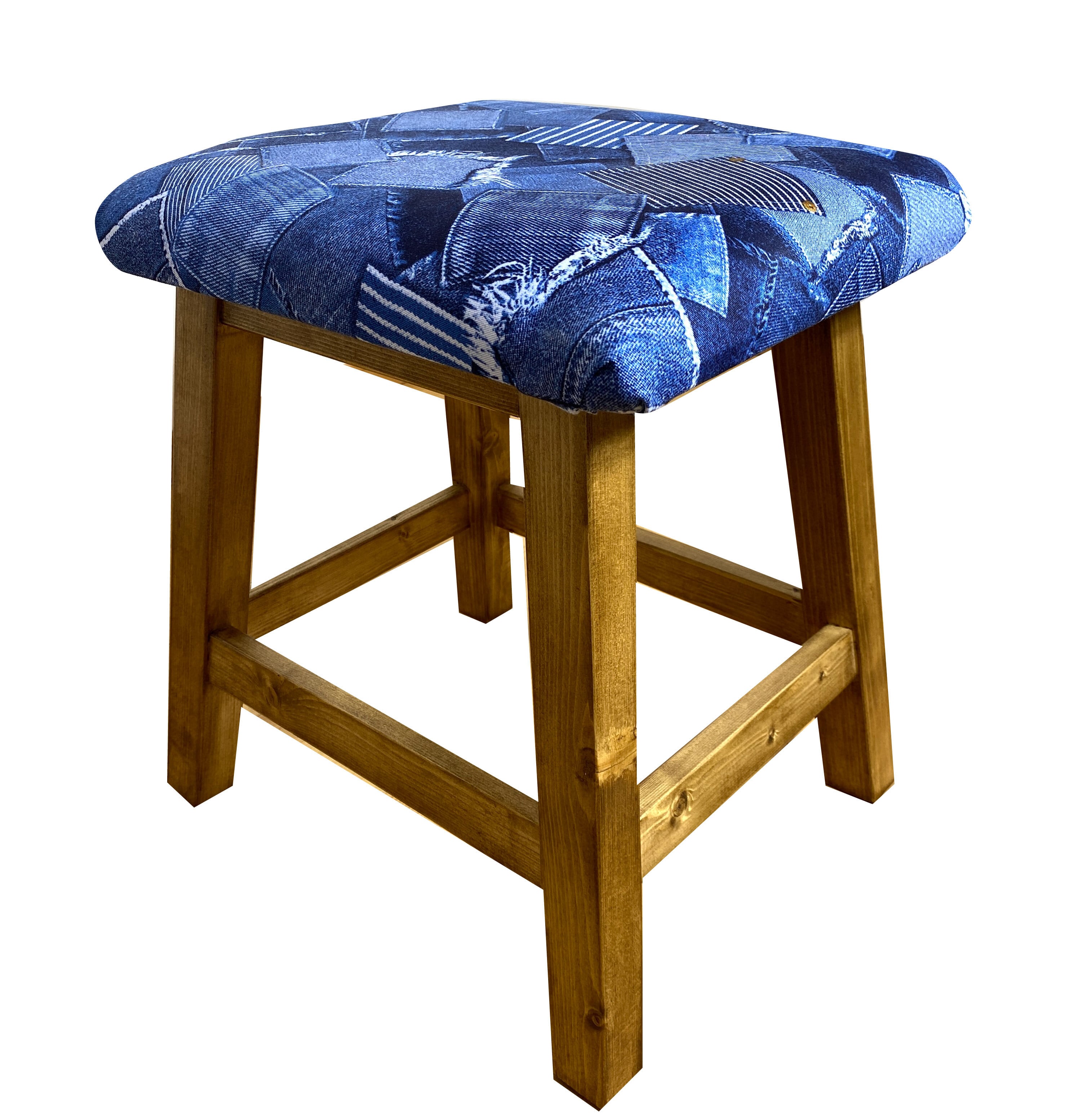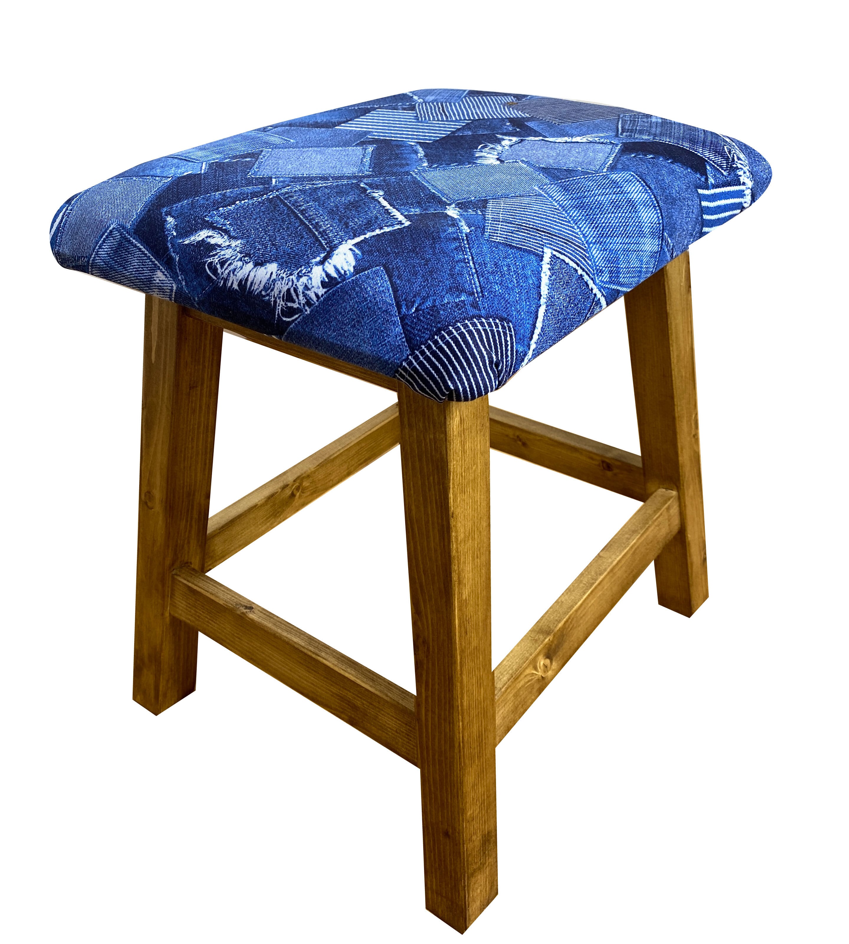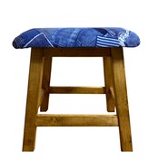 デニムパッチワークをリアルにプリントした生地で座面を制作したスツールです。