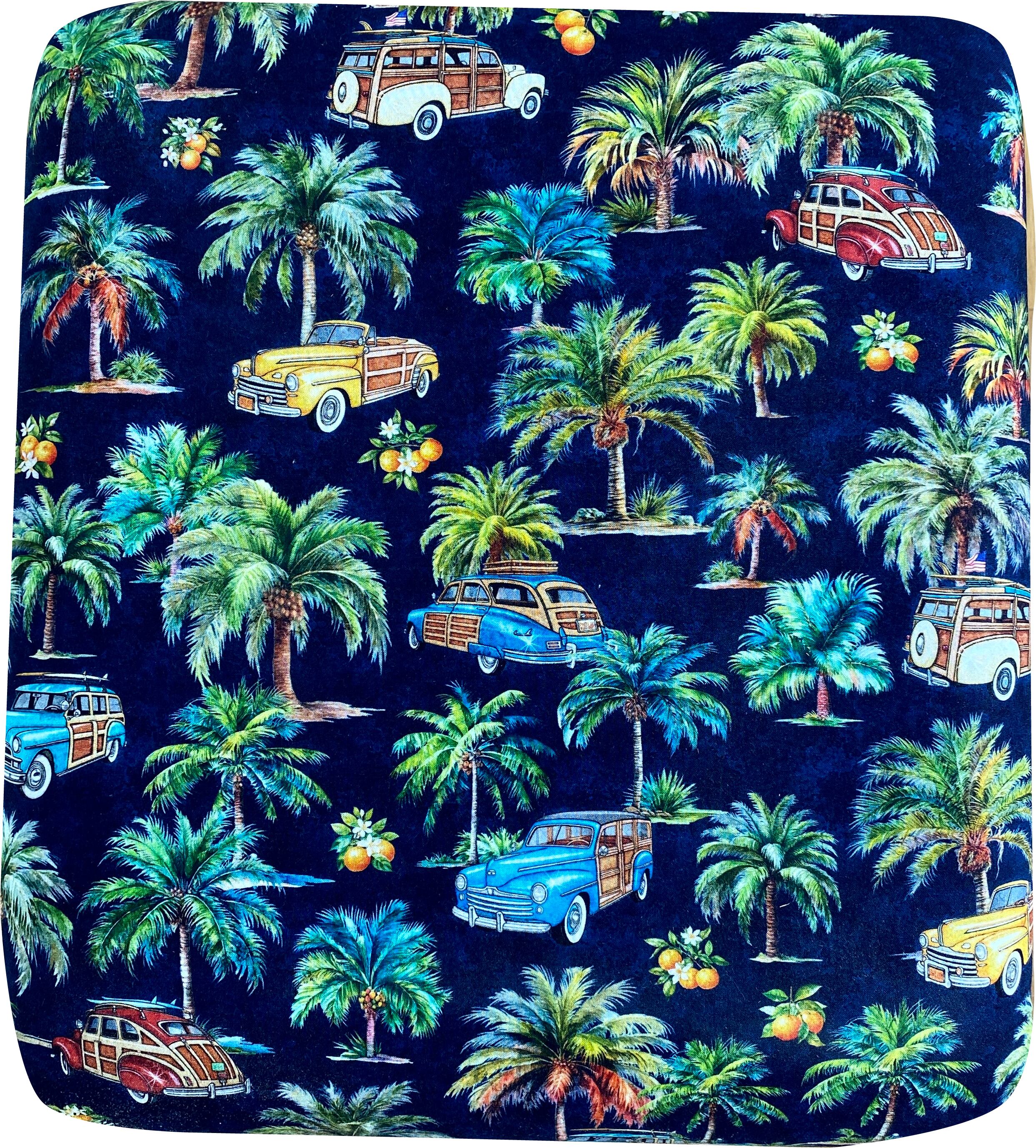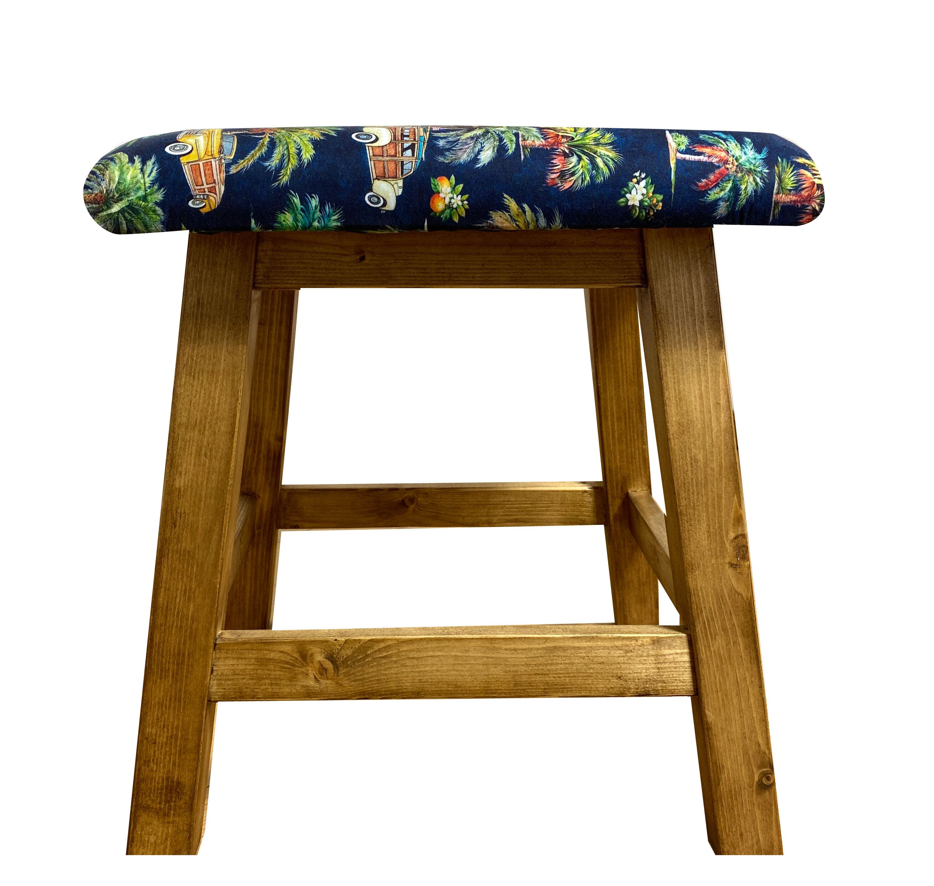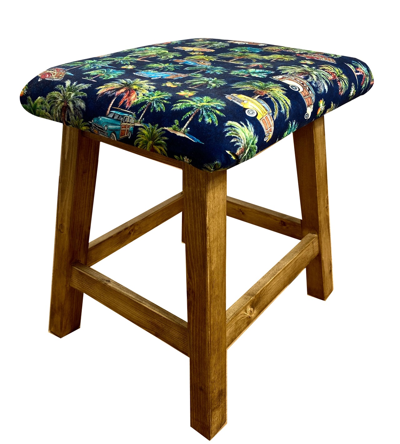 南国の海岸を連想させる椰子の木とクラッシックカーをモチーフにしたファブリックを使用したスツールです。